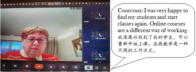 Nadine Courcoux是来自法国的外教,今年是Courcoux在公司任教的第3年。寒假期间,她在马来西亚旅游时不幸被偷走了护照等资料,只好滞留在当地申办新护照。为此,Courcoux不得不改变计划,于2月中旬直接从马来西亚回到法国。由于Courcoux把法国住宅的钥匙放在学校听松公寓,她只能寄宿在朋友家里。Courcoux在知晓学校开展在线教学的消息后,主动提出要与学院同步,开展网络教学。由于法国与中国有7个小时的时差,而且Courcoux每周有两次要在上午上课,这个时候正好是法国的半夜。法语教研室考虑到其年纪较大,还有时差的问题,提出可以让其他老师代课或者推迟上课。Courcoux婉拒了这个提议,还是坚决地承担了所有的教学工作。在教研室同事多次远程指导下,她学会了使用钉钉群上课。她说:“很高兴能为员工上课,网课跟传统的上课方式很不一样,目前正在适应中,进展也比较顺利”。