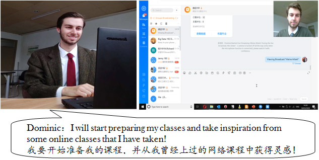 加拿大外教Dominic Richard是唯一一位留在小和山校区的外教。寒假期间,他原打算先去成都旅游,再去澳大利亚探望姐姐。 受疫情影响Dominic被迫取消了原先计划的行程,于是他就留在小和山校区听松公寓静心准备本学期的课程。Dominic虽然很年轻,却精通英、法、德三种语言。他在英国攻读英语语言文学硕士,去年毕业后来到我们学院任教。由于近期外籍教师紧缺,他主动承担了三个语种的口语课,还为英语专业员工开设“英美文学作品细读”的系列讲座。2月份以来,他一直配合着学校的管理,从未离开校园。他说尽管不能出校门,也没感到无聊,反而可以充分利用这段时间来读书、备课,同时也思考如何进行线上教学、如何适应员工多样化的需求。线上教学中,他使用钉钉屏幕共享的方式给员工上课,一边通过屏幕播放PPT,一边进行讲解。他的课堂运行流畅,互动性强,员工参与度高,教学氛围很好。